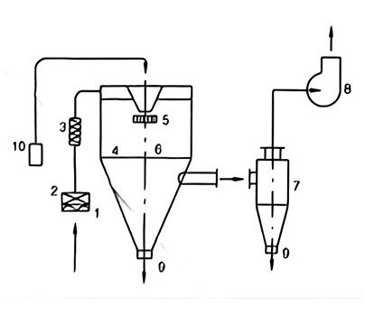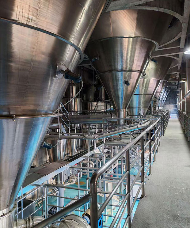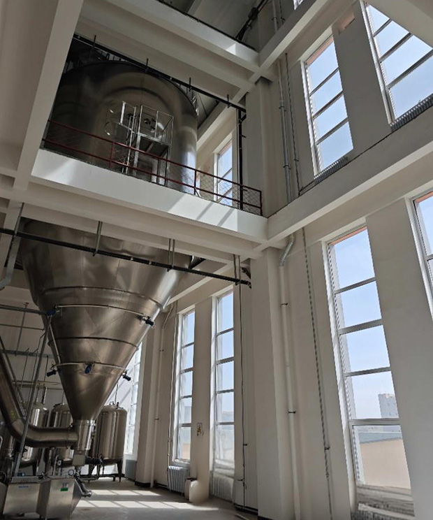 The air is filtered and heated before entering the air distributor at the top of the dryer. It then passes through the high-speed centrifugal atomizer on the top of the tower, which rotates to spray the liquid into extremely fine fog-like droplets. These droplets can be dried into finished products in a very short time when in contact with the parallel flow of hot air. The finished product is continuously output from the bottom of the drying tower and cyclone separator, and the exhaust gas is discharged by the fan.